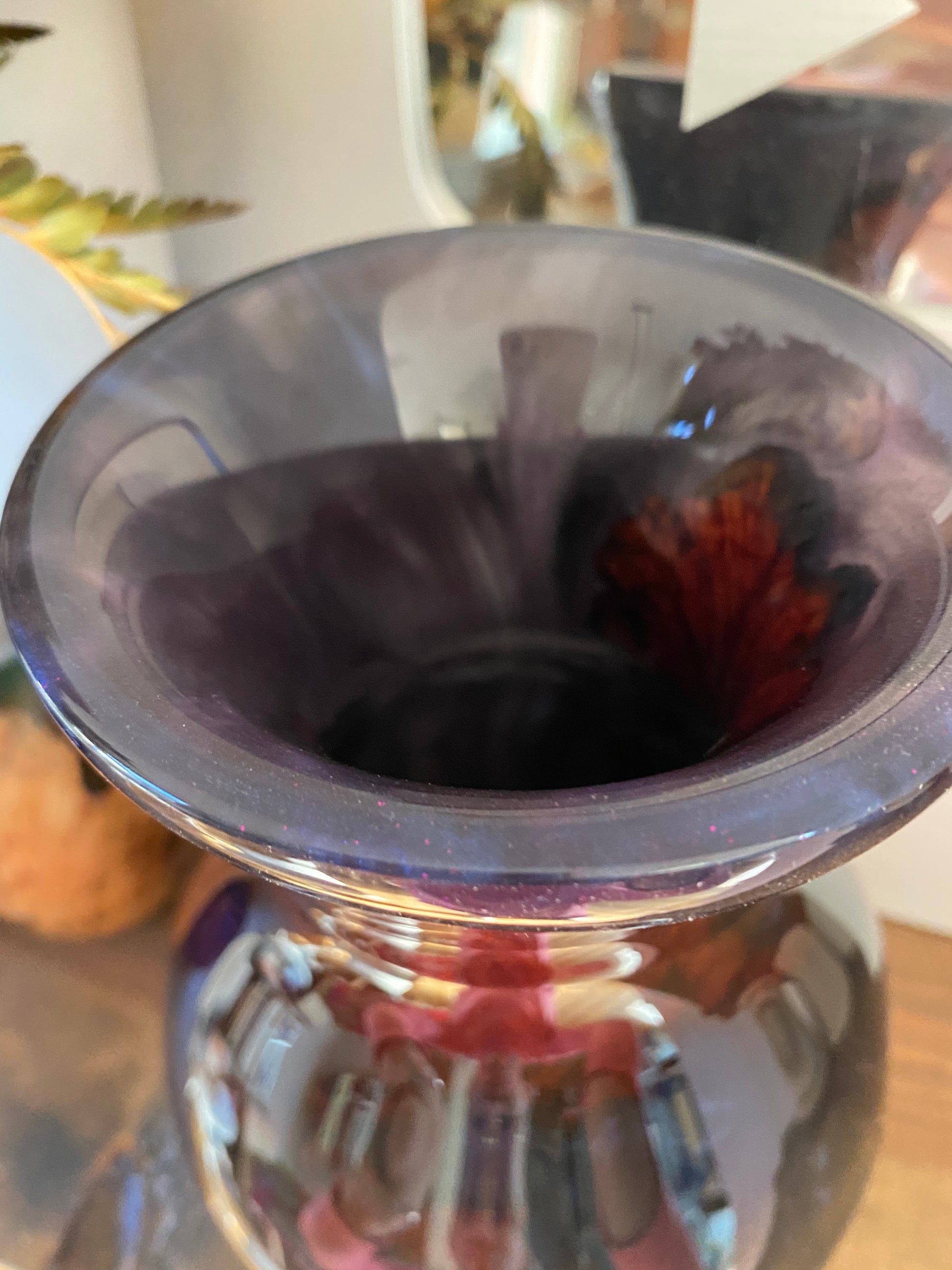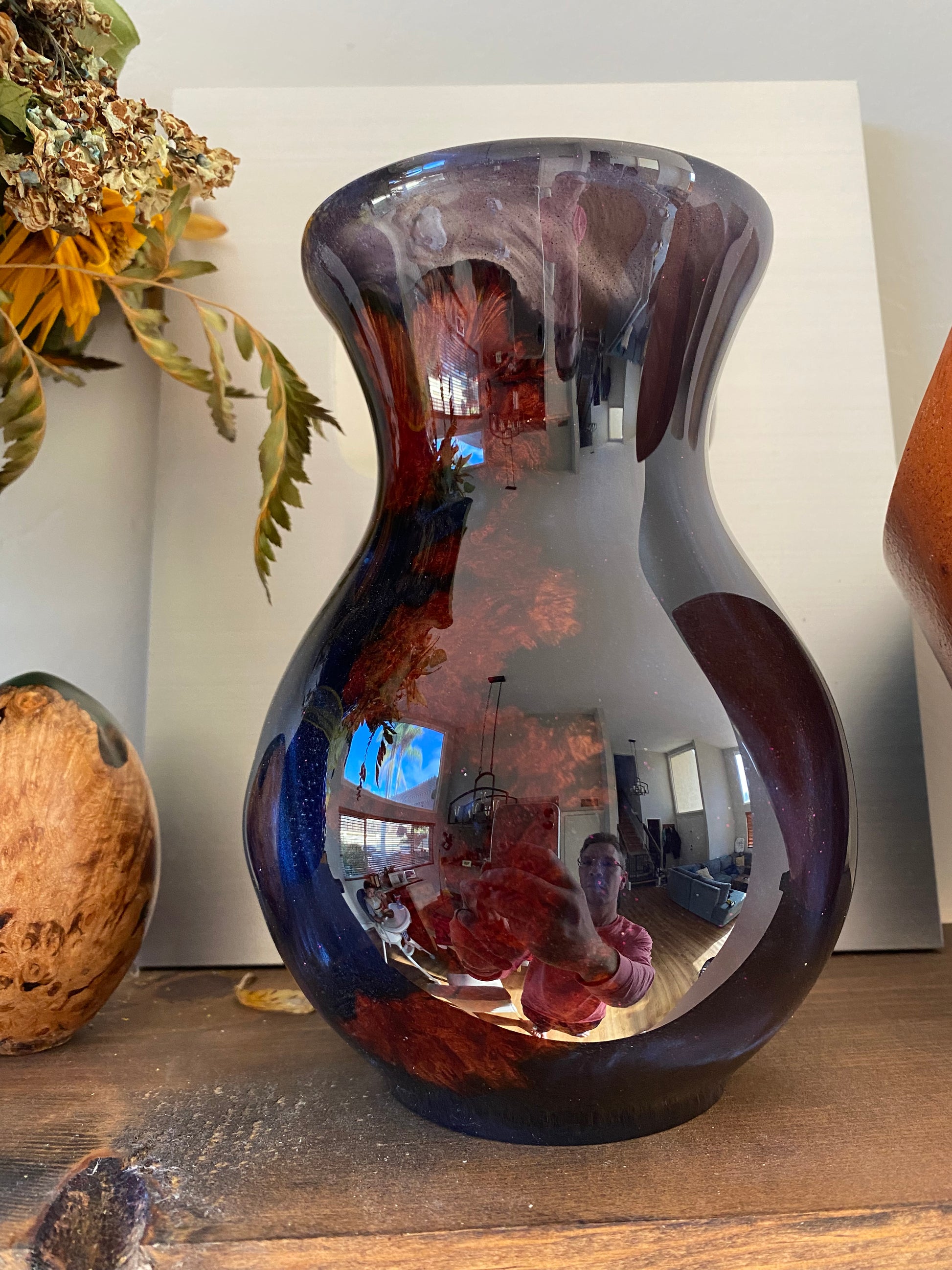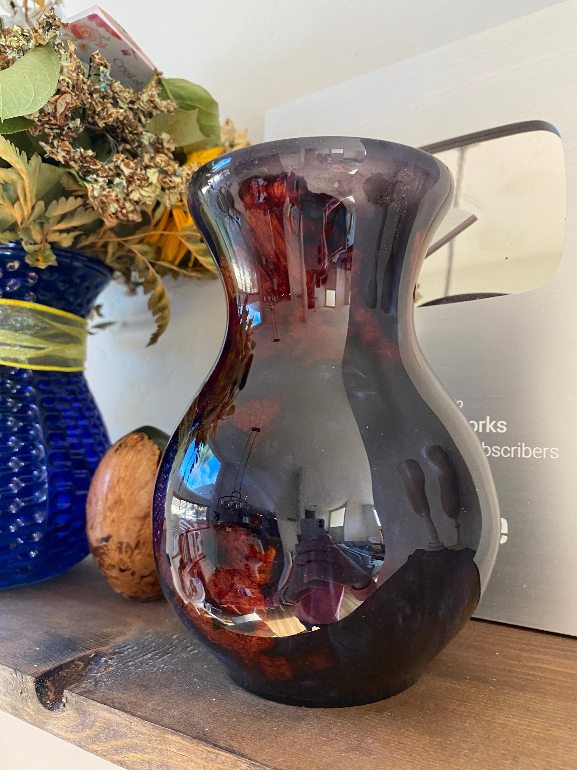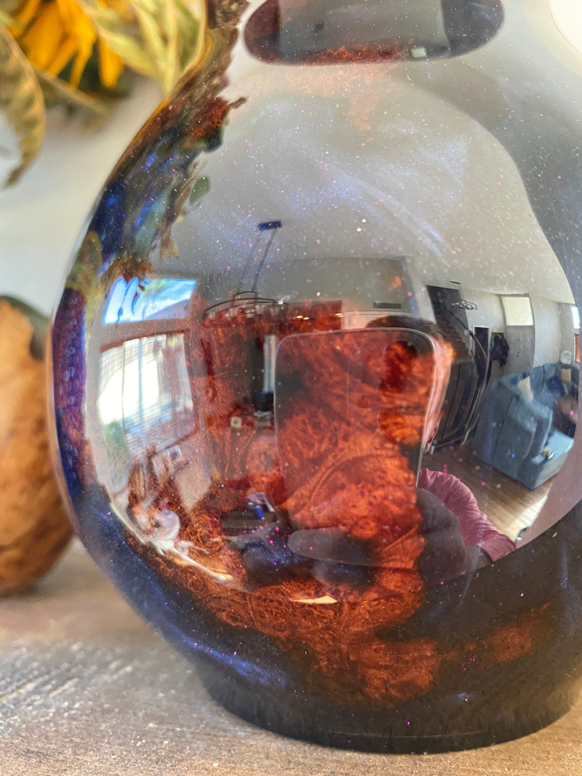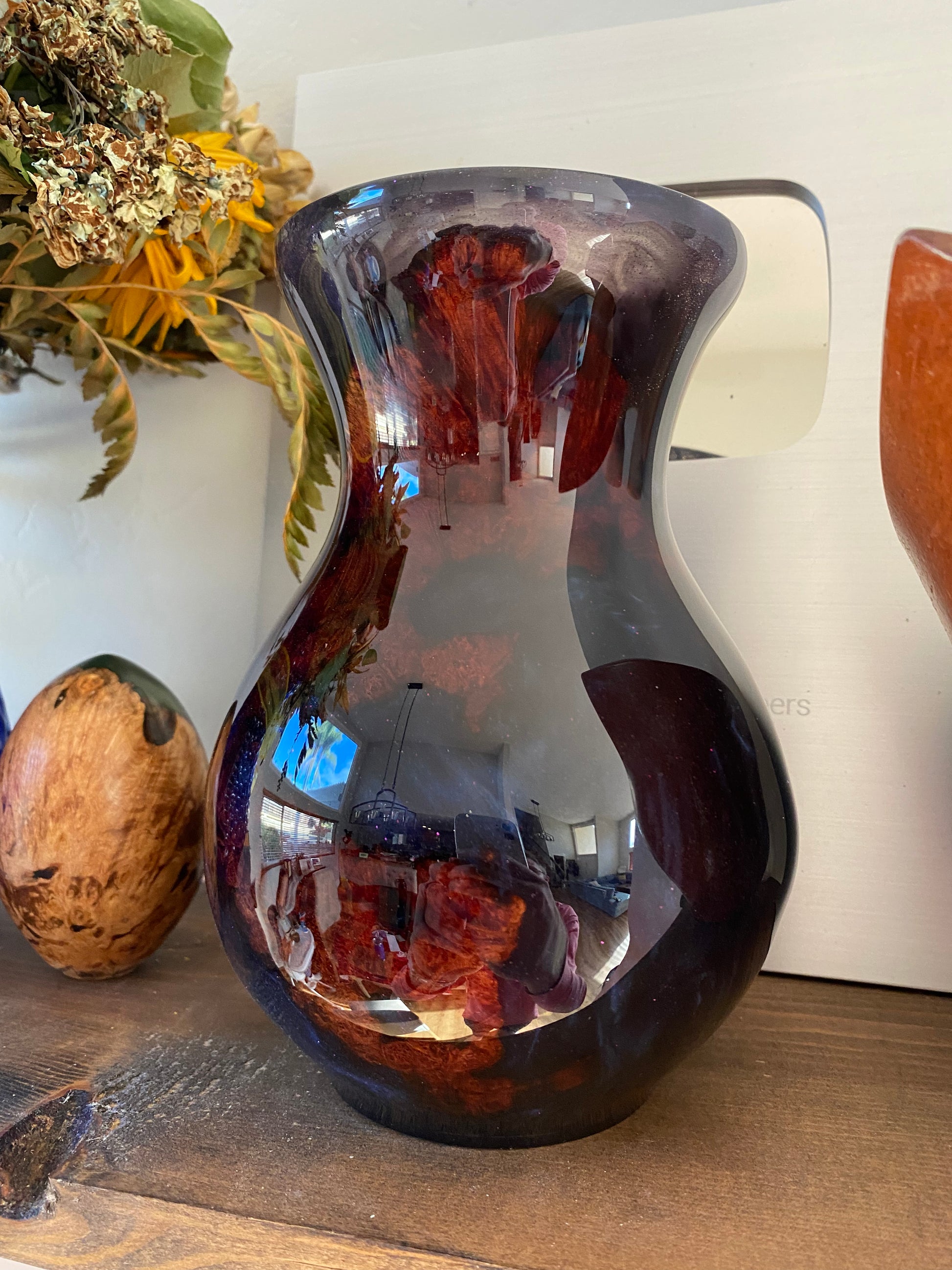 This vase was made from a chunk of manzanita burl mixed with purple and black resin, with hints of ruby glitter. It is about 7.25” tall and 5” wide at the widest point. The vase is completely waterproof and can be used to hold fresh flowers.